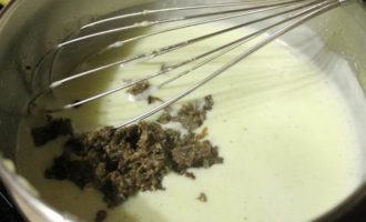 • Далее берем ковш, кладем в него масло, растапливаем его на медленном огне. Добавляем муку, хорошенечко вымешиваем и обжариваем 2 минуты. Затем потихоньку добавляем процеженное молоко, хорошо перемешивая венчиком, чтобы не было комочков. Варим 2-3 минуты и снимаем с огня.