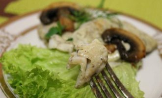 • В полученный соус добавляем тушеные грибы и хорошо все перемешиваем.