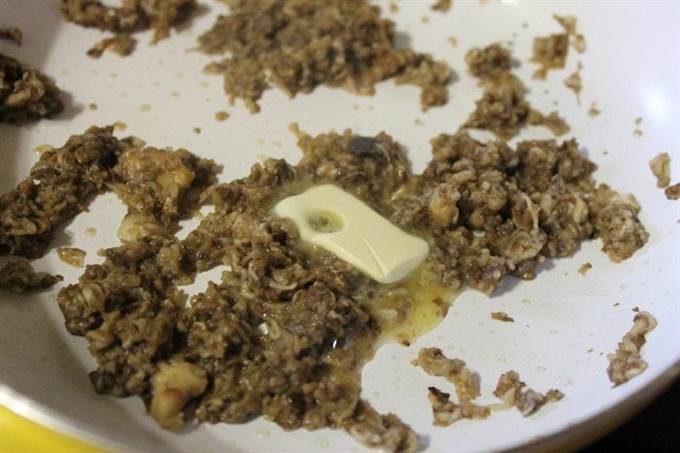 • Займемся теперь грибами. У меня были крупные шампиньоны. Два из них натираем на мелкой терке, кладем в сковороду, добавляем масло и тушим до испарения жидкости. Оставшийся гриб нарезать пластинками и обжарить с двух сторон до золотистой корочки. Он пойдет на украшение.