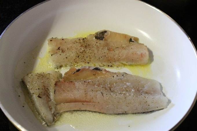 • Разогреть сковороду, добавить масло. Рыбу помыть, обсушить, натереть солью и перцем, и обжарить с двух сторон до легкого зарумянивания.