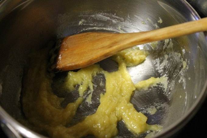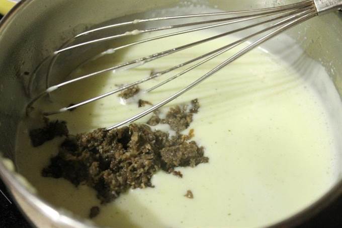 • Далее берем ковш, кладем в него масло, растапливаем его на медленном огне. Добавляем муку, хорошенечко вымешиваем и обжариваем 2 минуты. Затем потихоньку добавляем процеженное молоко, хорошо перемешивая венчиком, чтобы не было комочков. Варим 2-3 минуты и снимаем с огня.