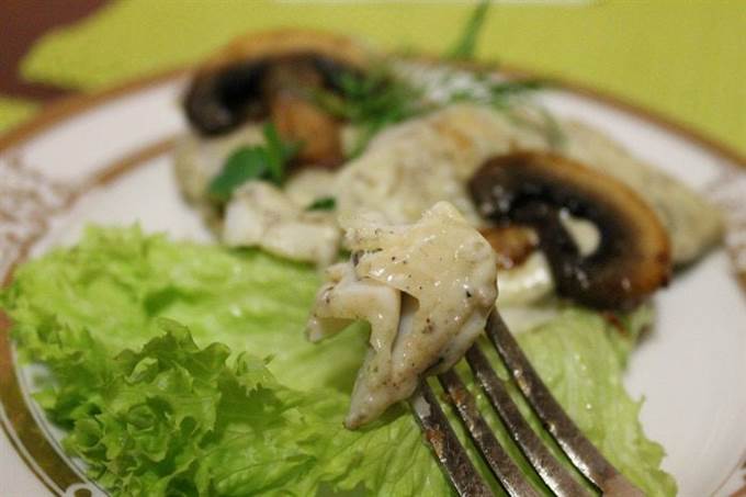 • В полученный соус добавляем тушеные грибы и хорошо все перемешиваем.