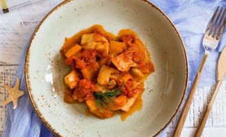 • Выложите в соус. Готовьте 5-7 минут под крышкой, пока рыба не потеряет прозрачность.