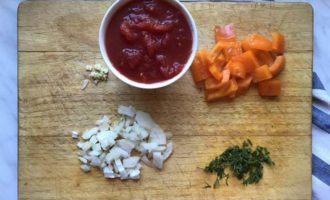 • Чеснок очистите и мелко нарежьте. Лук нашинкуйте. Укроп порубите. Перец очистите и нарежьте кусочками в 3 см.