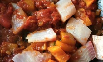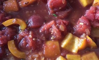 • Добавьте нарезанный перец и готовьте еще 5 минут. Затем добавьте рубленые помидоры, через 3 минуты влейте вино и доведите до кипения. Уменьшите огонь и тушите 10 минут. Соус должен слегка загустеть. Посолите по вкусу.