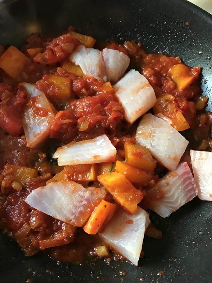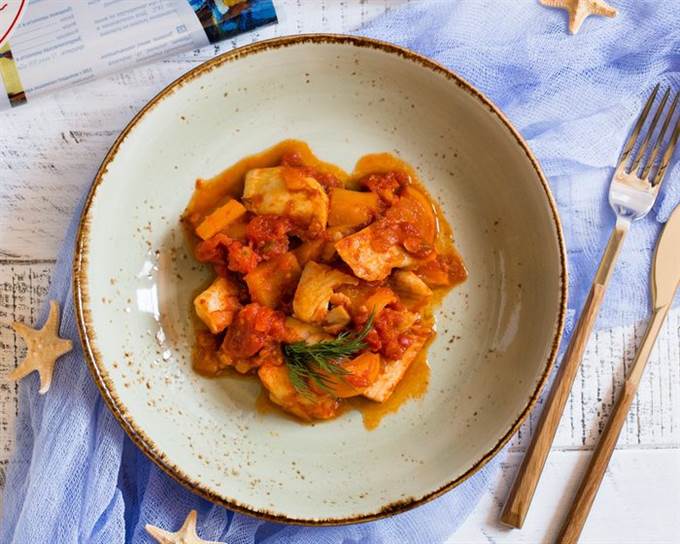 • Выложите в соус. Готовьте 5-7 минут под крышкой, пока рыба не потеряет прозрачность.