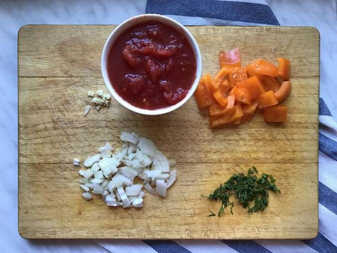 • Чеснок очистите и мелко нарежьте. Лук нашинкуйте. Укроп порубите. Перец очистите и нарежьте кусочками в 3 см.