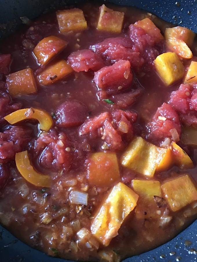 • Добавьте нарезанный перец и готовьте еще 5 минут. Затем добавьте рубленые помидоры, через 3 минуты влейте вино и доведите до кипения. Уменьшите огонь и тушите 10 минут. Соус должен слегка загустеть. Посолите по вкусу.