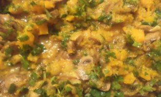• К луку с тыквой добавить обжаренные грибы, добавить соль, перец, лавровый лист и протушить ещё 5-10 минут.