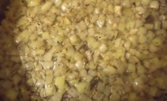• Луковицу почистить и нарезать средними кубиками. Чеснок почистить и мелко нарезать. Разогреть в сковороде 3 ст. л. растительного масла, выложить лук, чеснок и прованские травы. Обжаривать до прозрачности лука.