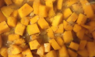 • Тыкву нарезать кубиками. К луку добавить тыкву, влить 1.5 стакана горячей воды, накрыть крышкой и тушить 15-20 минут.