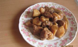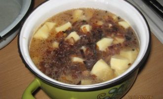 Все заливаем водой, чтобы вода накрыла картофель. Добавляем соль. Ставим тушиться на 1.5-2 часа. За 20 мин. до готовности добавляем лавровый лист для вкуса, можно положить и перец горошком. -