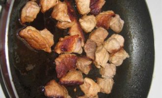 Нарезаем мясо кубиками. И жарим на сковороде, до образования темной корочки (если необходимо добавляем воды).