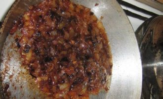 Нарезаем мелко лук. И обжариваем его до темно-коричневого состояния.