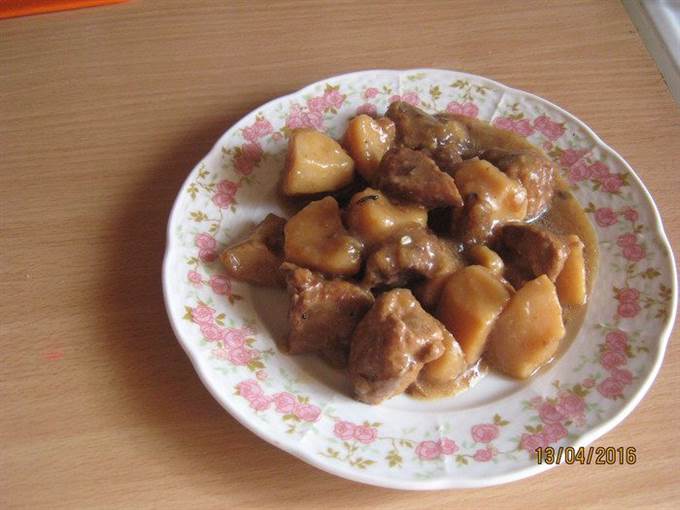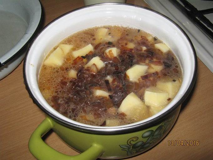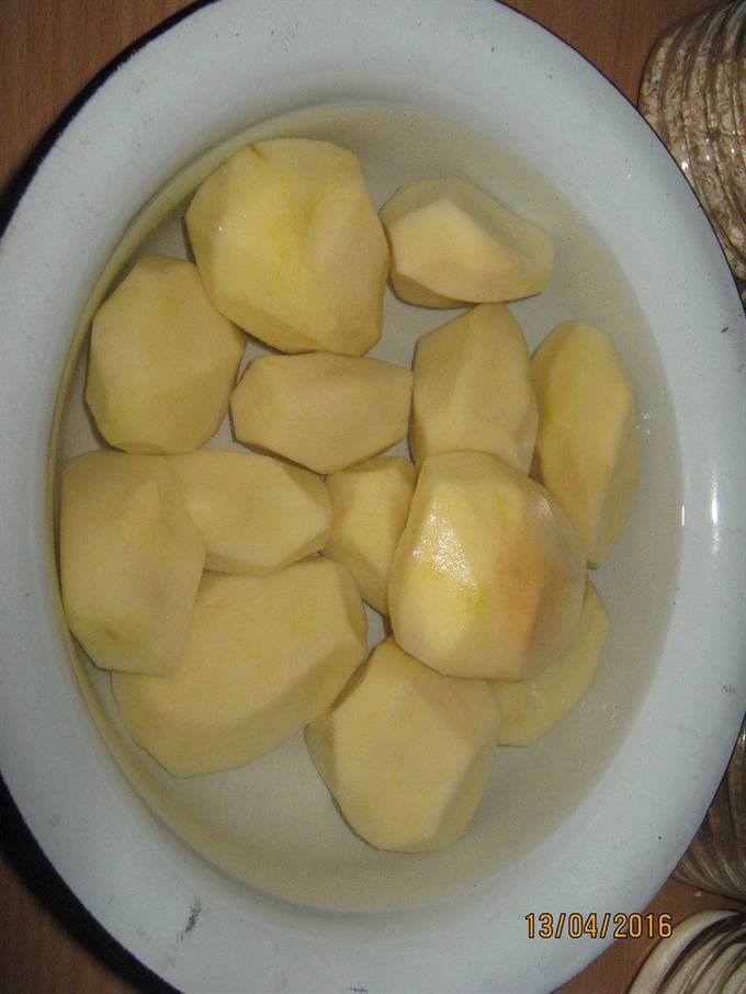 Все заливаем водой, чтобы вода накрыла картофель. Добавляем соль. Ставим тушиться на 1.5-2 часа. За 20 мин. до готовности добавляем лавровый лист для вкуса, можно положить и перец горошком. -