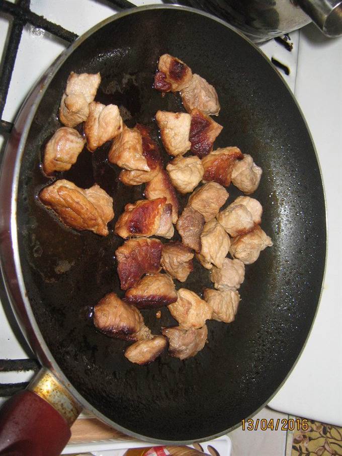 Нарезаем мясо кубиками. И жарим на сковороде, до образования темной корочки (если необходимо добавляем воды).