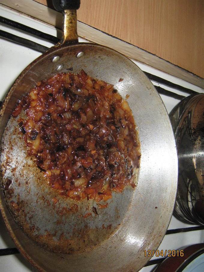 Нарезаем мелко лук. И обжариваем его до темно-коричневого состояния.