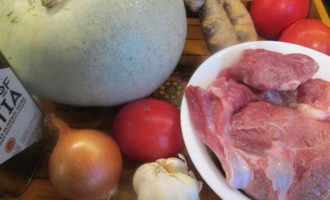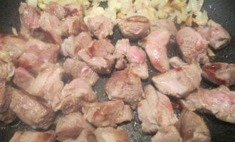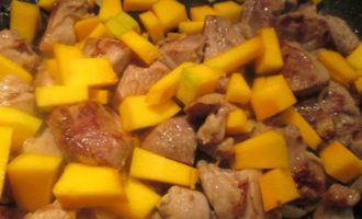 Далее добавляем тыкву, нарезанную кусочками и тушим под крышкой 8 минут.