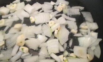 Обжариваем в сотейнике нарезанный лук и чеснок.