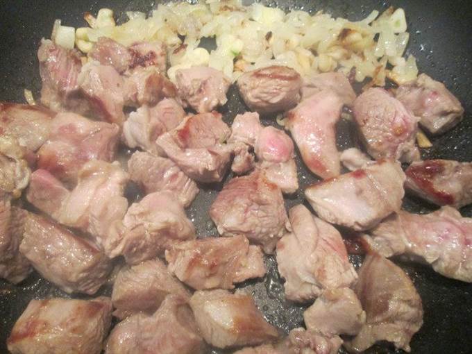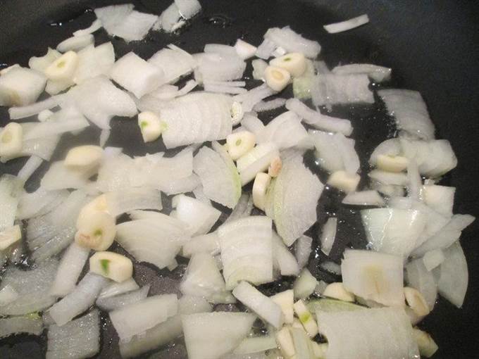 Обжариваем в сотейнике нарезанный лук и чеснок.