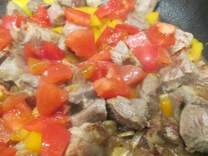 Теперь кладем нарезанные помидоры, добавляем 0,5 стакана воды, соль, перец, карри и готовим еще 20 минут.