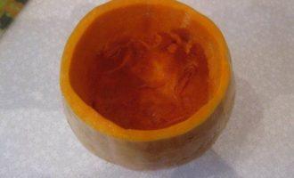 Моем тыкву. Отрезаем часть для горшочка. Острой ложкой вынимаем мякоть и семена. Мякоть тыквы режем брусочками.