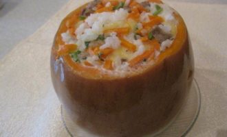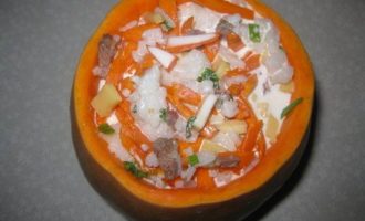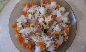 Говядину, рис, тыкву, лук зеленый и сыр перемешиваем.