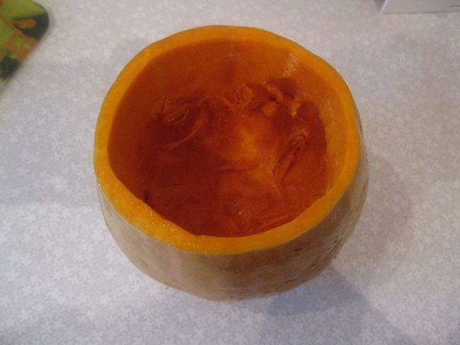 Моем тыкву. Отрезаем часть для горшочка. Острой ложкой вынимаем мякоть и семена. Мякоть тыквы режем брусочками.