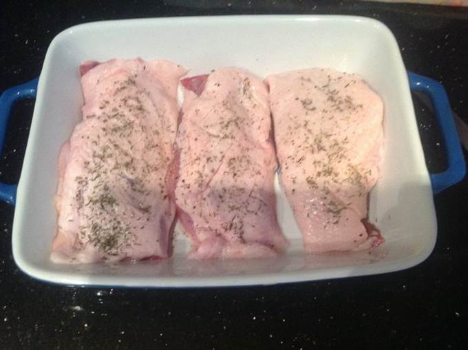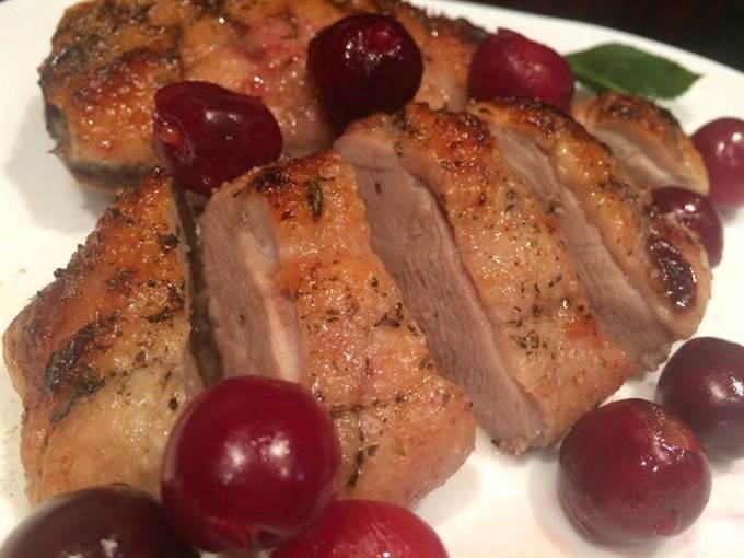 Утиные грудки вымойте, обсушите бумажным полотенцем, аккуратно сделайте надрезы на коже, натрите солью, перцем и тимьяном. Выложите в форму и поставьте в разогретую до 180 градусов духовку на 20 минут.