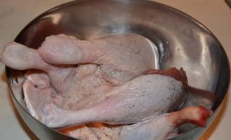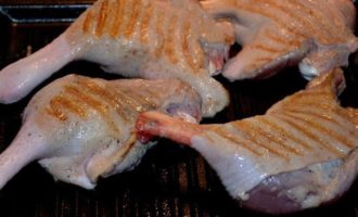 Обжарить на сухой холодной сковороде с двух сторон. Это значит положили ножки на сковороду и только после этого включили плиту, так утиная кожа не свернется.