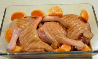 Утиные ножки общипать, помыть, просушить. Смешать все ингредиенты маринада, залить им ножки.