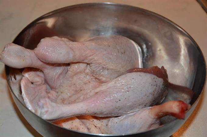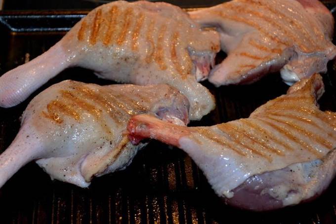 Обжарить на сухой холодной сковороде с двух сторон. Это значит положили ножки на сковороду и только после этого включили плиту, так утиная кожа не свернется.