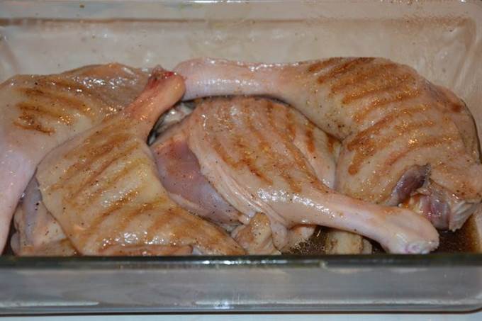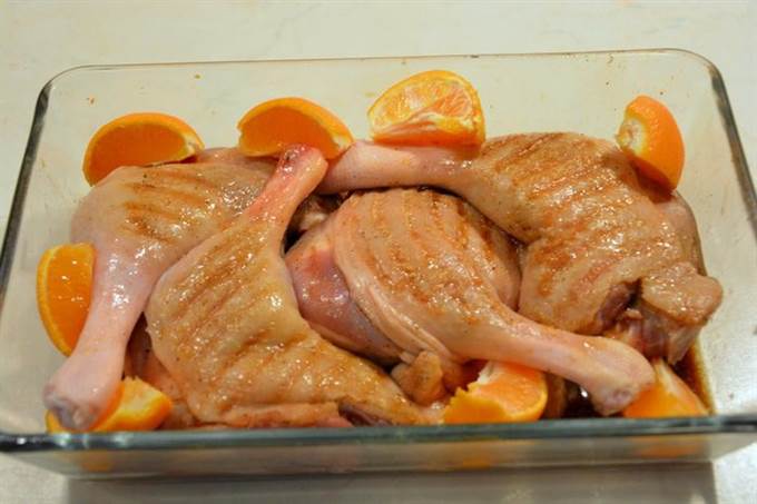 Утиные ножки общипать, помыть, просушить. Смешать все ингредиенты маринада, залить им ножки.