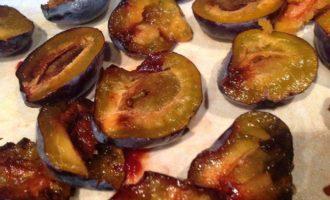 В это время приготовьте соус: сливы разрежьте пополам, удалите косточки.