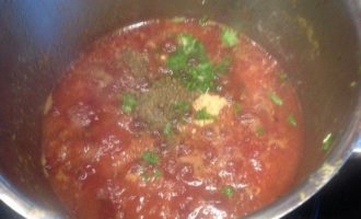 Снимите с огня и дайте немного остыть. Протрите массу через мелкое сито или пробейте блендером. Поставьте обратно на огонь, добавьте кориандр, имбирь, мяту, мелко рубленную кинзу. Доведите смесь до кипения и проварите 3-4 минуты.
