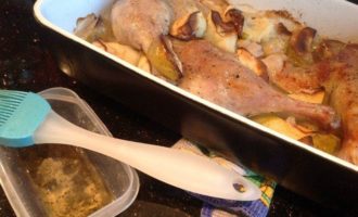 Смешайте соевый соус с медом, смажьте им утку за 10 минут до готовности.