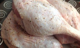 Утиные ножки промойте, обсушите бумажным полотенцем, посолите, поперчите, и оставьте на 20 минут промариноваться. -