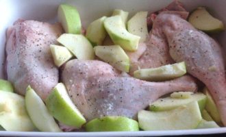 Утиные ножки вместе с яблоками выложите в форму для запекания и готовьте в духовке около часа.