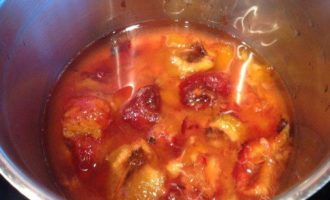 Положите в сотейник, влейте 0,5 стакана воды, накройте крышкой и доведите до кипения. Варите 5-6 минут, до тех пор пока сливы не разварятся.