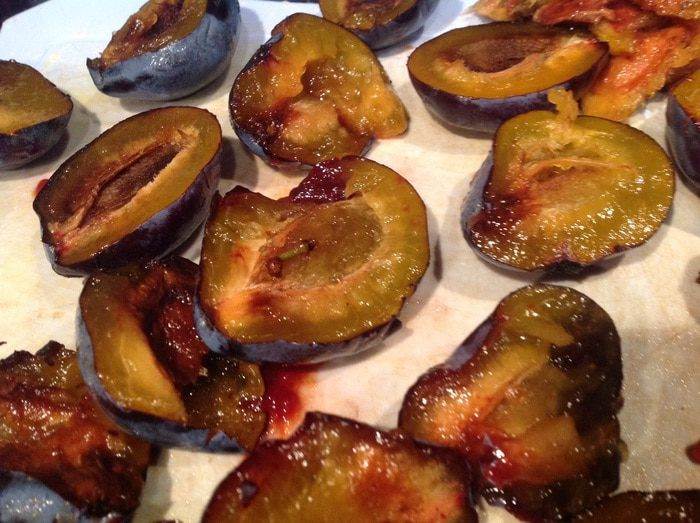 В это время приготовьте соус: сливы разрежьте пополам, удалите косточки.