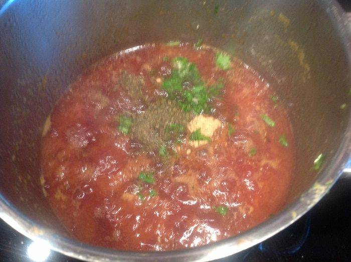 Снимите с огня и дайте немного остыть. Протрите массу через мелкое сито или пробейте блендером. Поставьте обратно на огонь, добавьте кориандр, имбирь, мяту, мелко рубленную кинзу. Доведите смесь до кипения и проварите 3-4 минуты.
