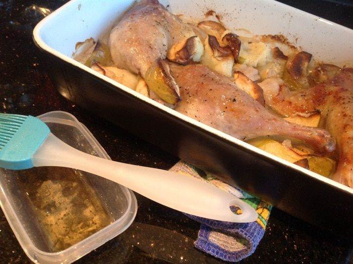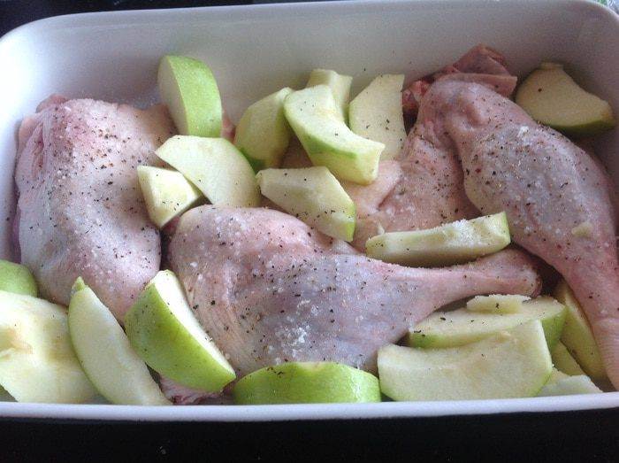 Утиные ножки вместе с яблоками выложите в форму для запекания и готовьте в духовке около часа.