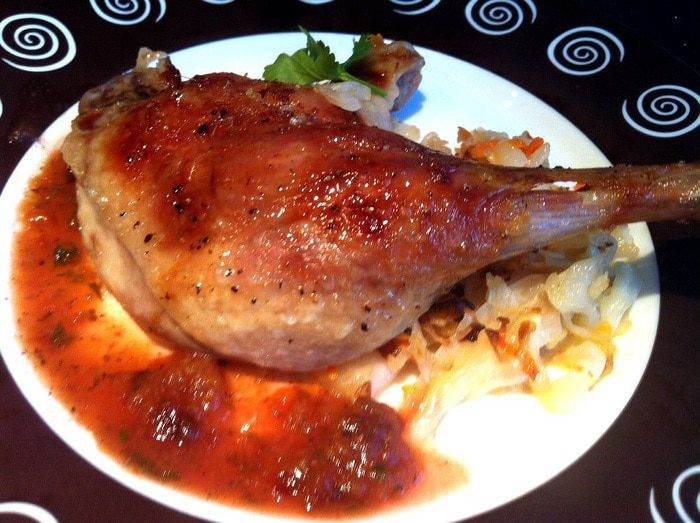 Утиные ножки промойте, обсушите бумажным полотенцем, посолите, поперчите, и оставьте на 20 минут промариноваться. -
