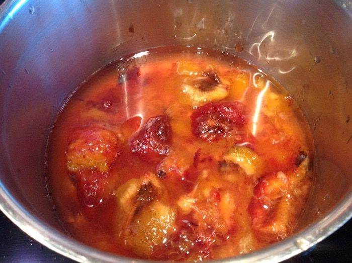 Положите в сотейник, влейте 0,5 стакана воды, накройте крышкой и доведите до кипения. Варите 5-6 минут, до тех пор пока сливы не разварятся.