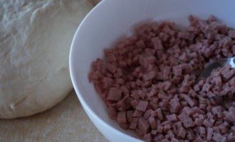 Мелко порезать колбасу, я беру всегда «Докторскую», она без вкраплений сала, добавить 1-2 щепотки молотого черного перца.