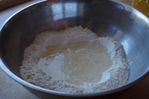 Приготовить тесто из муки пшеничной, добавляя растительное масло, воду, водку и соль. Хорошо замесить. Муки — сколько возьмет! У меня получилось даже больше, около 900 г.