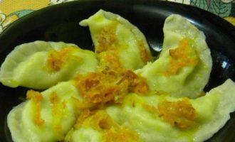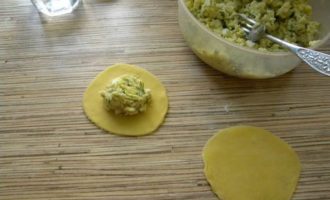 Стаканом вырезаем кружки в них кладем начинку и защипываем края хорошо.