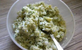 Яйца отвариваем. Смешиваем сыр с картофельным пюре, зеленью, яйцом.