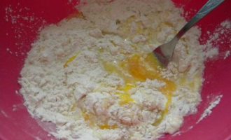 Делаем тесто, просеянную муку с солью кладем желтки и холодную воду, растопленное масло, замешиваем тесто и кладем в холодильник на 30 минут.