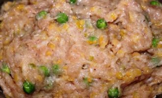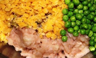 Соединить фарш с чечевицей и зеленым горошком. Зеленый горох предварительно следует обдать кипятком и откинуть на дуршлаг
